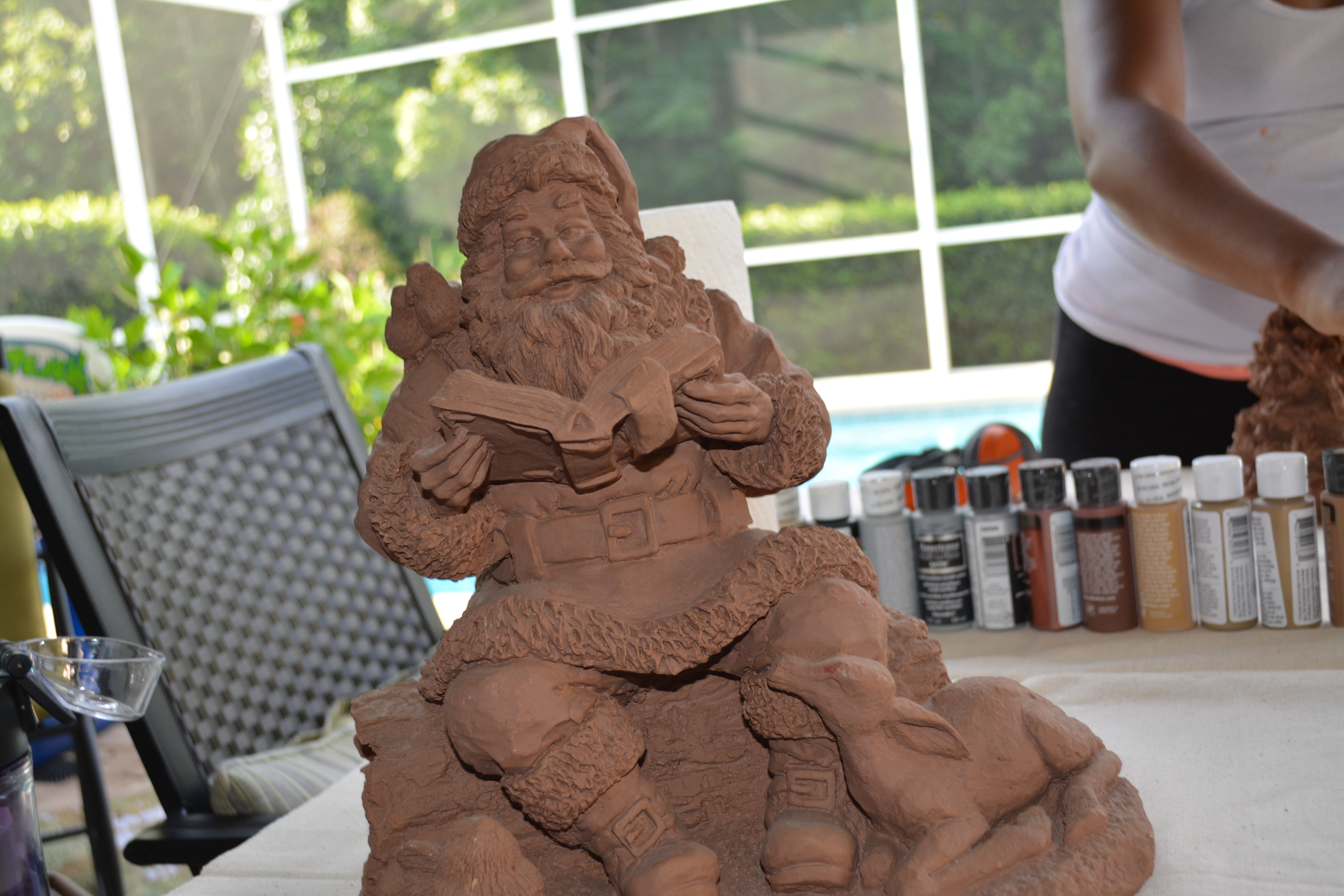I telephoned my son and asked him to dig out a couple of the unpainted Xmas holiday pecan resin figurines stored in the basement of our home in Wisconsin. I had purchased them in North Carolina at a flea market more than twenty years ago. He sent seven figurines and these are the two that Lady C and I decided to paint.